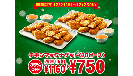 マクドナルドは12月21~25日の期間、通常価格1160円の「チキンマックナゲット 30ピース」が35%オフの750円になるキャンペーンを実施する。
