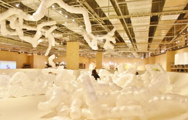 白くて柔らかい「大きなお皿」や「ファクトリー」など7つのエリアで、身体を使った遊びやワークショップが楽しめます。