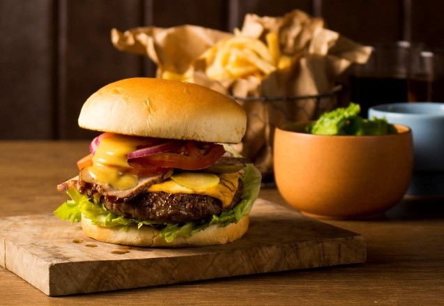 自家製ベーコンを使用したBTLバーガー。つなぎを使わない食べごたえあるビーフパテとスモークしたハニーマスタードソースで食べごたえ抜群のバーガー。