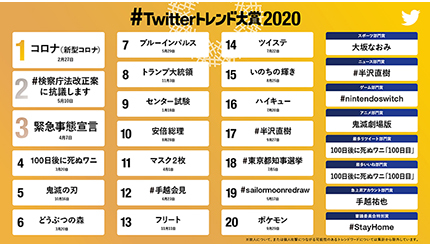第1位は「コロナ(新型コロナ)」。第2位が「#検察庁法改正案に抗議します」、第3位が「緊急事態宣言」と、新型コロナウイルス感染症の影響が反映される結果となった。