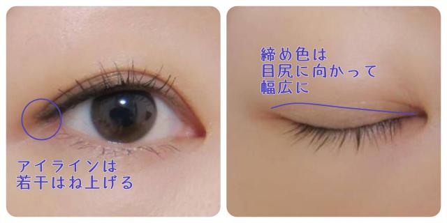 アイメイクでは、上昇ラインを意識。締め色を目尻に向かって幅広に塗っていくのがコツです。さらに、アイラインを若干はね上げ気味にすると、上昇ラインが強調されます。