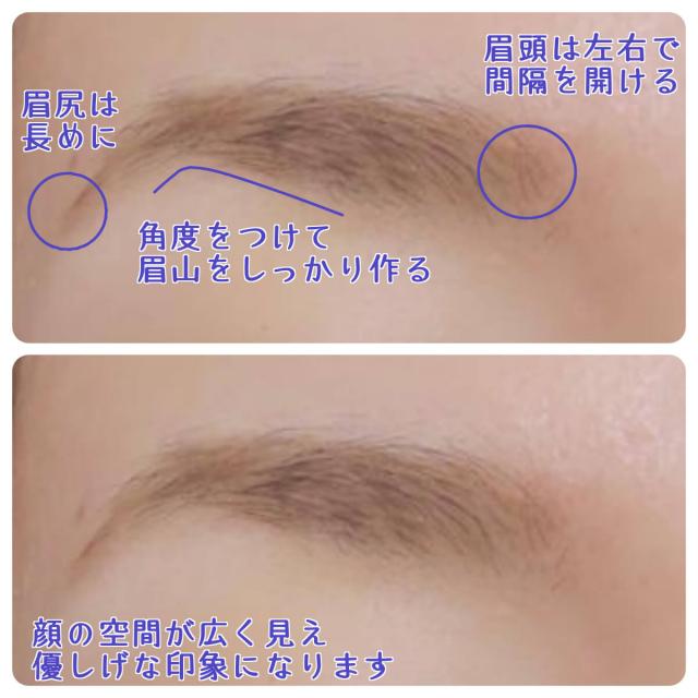 まず、眉頭は左右で間隔を開けるようにします。これだけでも、親しみやすいイメージになります。