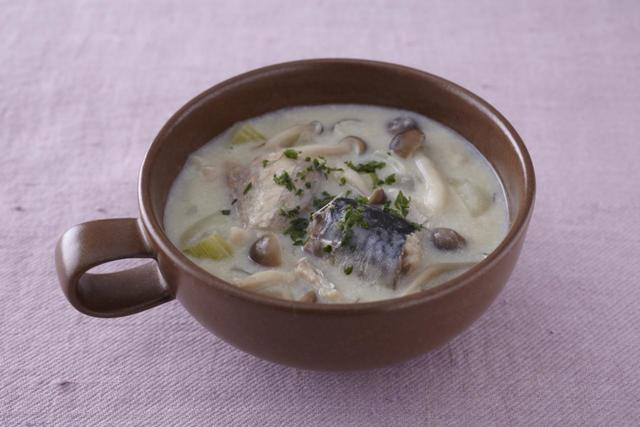 さば缶を缶汁ごと入れてうまみたっぷりに。乳脂肪分が気になる牛乳は使わず、コレステロールゼロの無調整豆乳を使います。