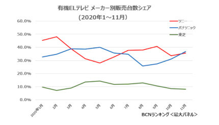 全国の家電量販店やネットショップでPOSデータを集計する「BCNランキング」によると、有機ELテレビの販売台数シェア(2020年1~11月)で、ソニーが37.4%のトップを走る。だが、8月以降、パナソニックが猛烈な追い上げを見せており、追われる立場のソニーがどこまで逃げ切るかが争点になってきた。
