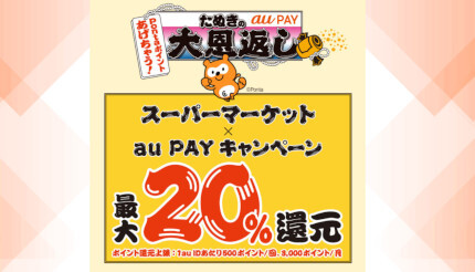 いずれも「たぬきの大恩返し」キャンペーンによるもので、スーパーはイトーヨーカドーやオーケー、サミット、東急ストア、ベイシア、オークワ、かねひで、近商ストア、フジなど多数が対象になる。au PAYで支払うと1回のごとにPontaポイントが20%(200円/40ポイント)還元される。ポイント還元上限は500ポイント/回、3000ポイント/月となっている。
