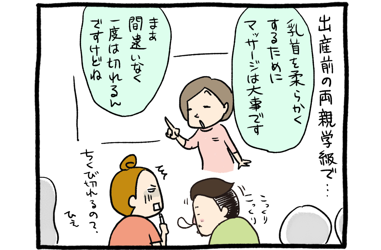 「乳首マッサージ」もそこそこのパワーワードですが、何をするかというと、飲む力の弱い新生児が母乳を吸いやすいように、柔らかくほぐすんですね。乳輪を指先で鷲掴みにして、そこそこ力を入れてグイグイとほぐしていきます。