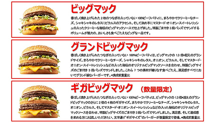 グランドビッグマックとギガビッグマックは、1月6日~1月下旬の期間限定で販売され、グランドビッグマックが単品で税込み540円、バリューセットで同840円、ギガビッグマックが単品で同740円、バリューセットで同1040円。なお、ギガビッグマックは数量限定となる。
