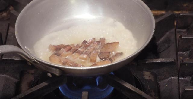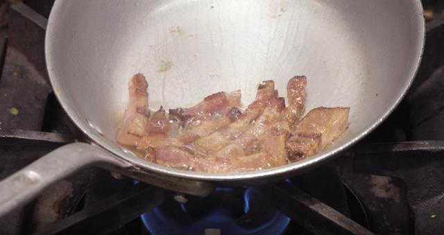6.煙が出てきたら弱火にして、グアンチャーレが持っている余分な水分や臭みを飛ばしながら、カリカリにするまで焼きます。