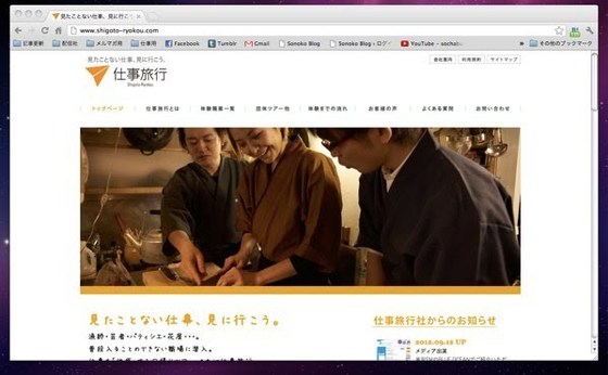そのユニークなサービスとは、仕事と旅行を一緒にした「仕事旅行」。その名の通り、気軽に仕事体験できるツアーだ。「見たことない仕事、見に行こう。」をコンセプトに、パティシエ、エステティシャン、枕職人、芸者、整体師、寿司職人、ブックセレクター、コピーライター、盲導犬歩行指導員、フードデザイナーなど、全52種類ものさまざまな仕事が用意されている。運営者に話を聞いてみた。