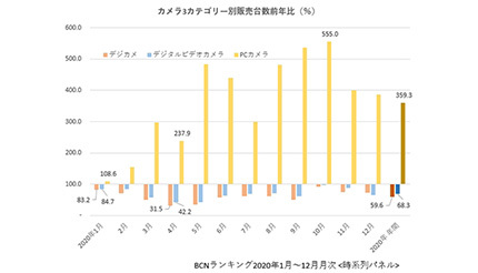 世界中が未曾有の事態に陥った2020年。デジタル家電市場も大きな影響を受けた。中でも、同じようなカテゴリながら、影響がプラスとマイナスに大きく分かれた市場がある。カメラだ。国内デジタル家電市場のPOSデータを集計するBCNランキングのデータから明らかにする。 カメラ市場には大きく分けて用途別に三つある。写真撮影のデジカメ、動画撮影のデジタルビデオカメラ、PCと接続して画像や映像を撮影するPCカメラだ。これら3カテゴリで、2020年の販売台数前年比を見ると、デジカメが59.6%、デジタルビデオカメラが68.3%、PCカメラが359.3%という結果になった。PCカメラは19年比で市場が3.6倍に急拡大したのに対し、デジカメとデジタルビデオカメラは市場が3割から4割の市場縮小に苛まれたわけだ。