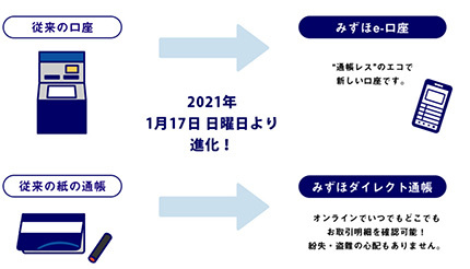 新型コロナウイルス感染症の感染拡大に伴う「新しい生活スタイル」に対応する、みずほ銀行の新サービス「みずほ e-口座」が2021年1月18日にスタートする。同時にみずほ銀行は、通帳発行・繰越ごとに1冊1100円の通帳発行手数料を新設する。 楽天銀行、住信SBIネット銀行など、インターネット銀行は以前から「通帳レス」であり、通帳を使った手続きメニューはない。みずほ銀行も同等になると考えると分かりやすい。三菱UFJ銀行も「Eco通帳(インターネット通帳)」への切り替えを推進しており、都市銀行は、リアル支店のあるネット銀行だと認識を改めたほうがいいだろう。