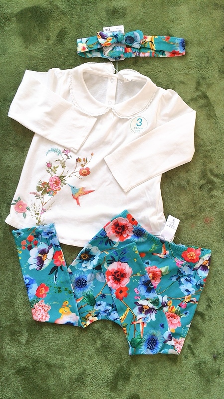 ブラウンのブラウスにオレンジ、ブルー、グリーンなどを基調とした花柄のレギンス、ヘッドバンドがセットになっています。