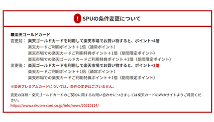 楽天ゴールドカードは、分類上は「ゴールドカード」だが、年会費は税込2200円と、一般的なゴールドカードより安く、年会費の負担とSPUにおける「ポイント+4倍」のメリットを比較すると、SPUのポイントアップの恩恵のほうが大きいといわれていた。なお、年会費1万1000円(一般的なゴールドカードと同額)の楽天プレミアムカードの条件の変更はなく、引き続き「ポイント+4倍」となる。