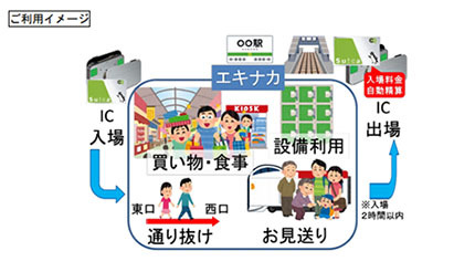 在来線の駅構内にある商業施設やロッカーなどの設備(エキナカ)だけを利用したい場合、従来は入場券を購入する必要があったが、IC入場サービス導入後、JR東日本 Suicaエリア(首都圏・仙台圏・新潟圏)の各駅在来線改札内で全国相互利用対象の10種類の交通系ICカード(Suica、PASMO、Kitaca、TOICA、manaca、ICOCA、PiTaPa、nimoca、SUGOCA、はやかけん)を利用して同一駅のゲート型自動改札機を出入りするだけで、自動的にきっぷの入場券と同額(140円または150円)が清算される。