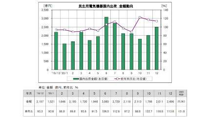 日本電機工業会(JEMA)は1月25日、2020年暦年(1~12月)の国内白物家電の出荷金額が2兆5363億円(前年比101.0%)となり、24年ぶりの高水準になったと発表した。5年連続でプラスになるなど好調さが持続している。