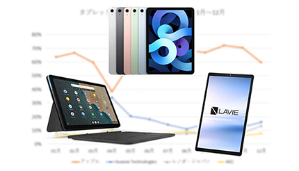 全国の家電量販店やECショップでPOSデータを集計する「BCNランキング」によると、12月のタブレット端末の販売台数は前年同月比82.3%だった。大幅に落ち込んだが、2019年12月の市場が絶好調だったこともあり、高い水準は維持している。同カテゴリで販売台数が前年を下回るのは20年4月以来、8カ月ぶりとなる。