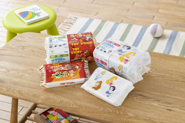もっと手に優しい、成分の99.9%以上が純水でできた手・口ふきシートは<トイ・ストーリー>と<ディズニープリンセス>のデザイン。(<ミッキー&ミニー>は、30枚入×2個 248円)