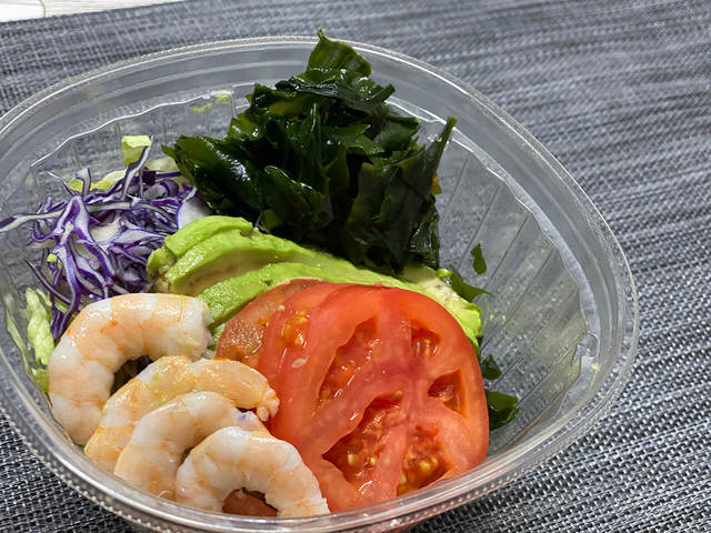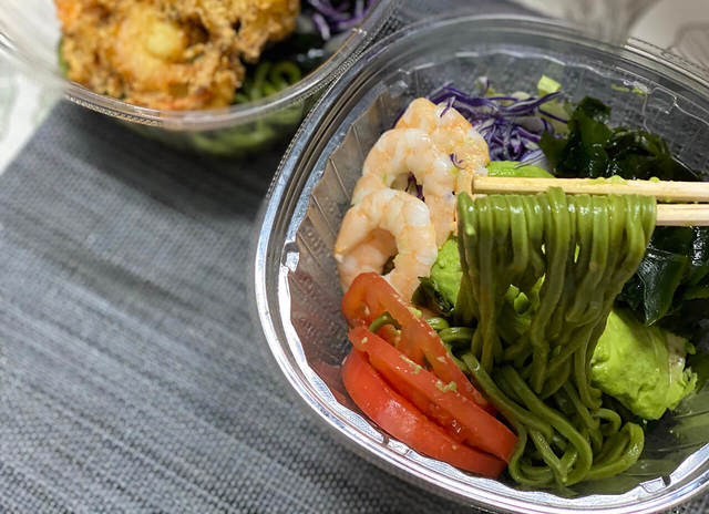 えびとアボカドのサラダわかめ麺は、麺が全くみえないくらいにたっぷりと野菜や海老、わかめが乗せられているサラダ感覚のメニュー。