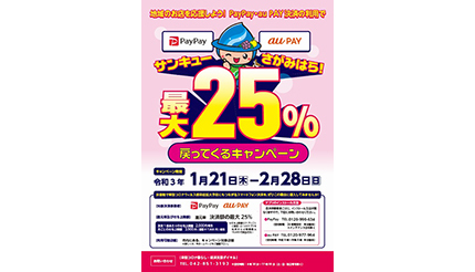 神奈川県央エリアの相模原市は、KDDI、PayPayと共同で、地域経済の活性化とキャッシュレス決済の普及促進を目的に、市内の対象店舗でスマートフォン(スマホ)決済サービス「au PAY」もしくは「PayPay」で支払うと、それぞれ25%相当が還元される「サンキューさがみはら!最大25%戻ってくるキャンペーン」を実施している。キャンペーン期間は1月21日~2月28日の39日間。