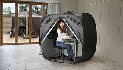 マルチパーテーションテントは、幅130×高さ150×奥行き130cmという十分な作業スペースを確保可能で、内部に作業用テーブルや椅子を設置できる。内部にシルバーコーティングを施し、外側からの光の透過が少ない構造で内側からの光も漏れにくく、周囲を気にすることなく作業に打ち込める。