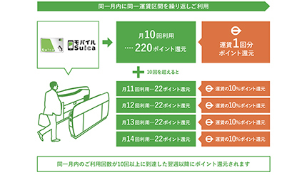 リピートポイントサービスは、JR東日本の在来線全てのSuicaエリアを対象に、モバイルSuica/Suicaのチャージ残高で同一運賃区間の利用が同一月内に10回あった場合に、運賃1回分相当をJRE POINTで還元するサービス。さらに、月11回以上の利用で、1回ごとに毎回運賃の10%をJRE POINTで還元する。