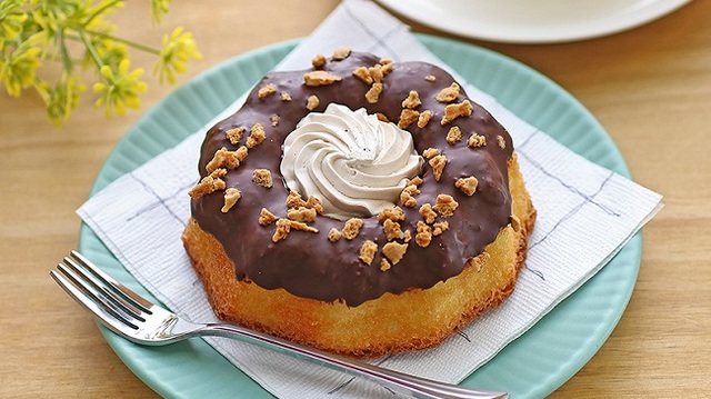 チョコがけのクグロフケーキに、アーモンドホイップとアーモンドクランチがトッピングされています。