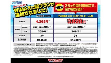 ヨドバシカメラは、ワイヤレスブロードバンドサービス「ワイヤレスゲートWi-Fi+WiMAX2+」サービスの新プラン「ワイヤレスゲートWi-Fi+WiMAX ギガ放題ネクスト+LTE 3年ずーっと割」の販売を、ヨドバシカメラ限定で2月8日に開始した。