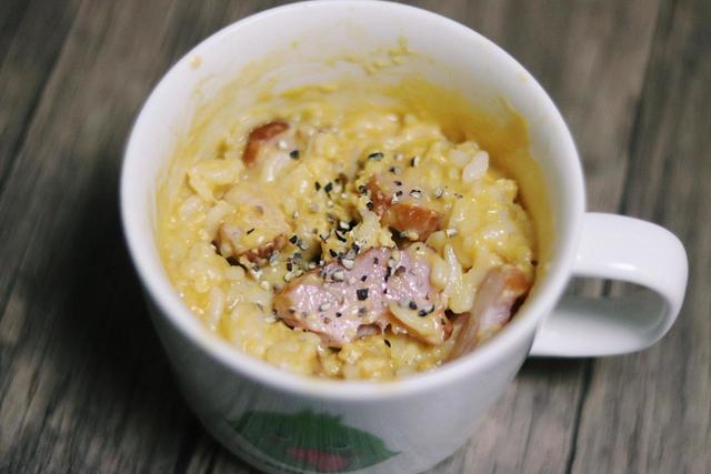 マグカップにご飯とベーコンを入れ、その上に牛乳、水、コンソメを合わせて入れます(水と牛乳は1:1)。ここでラップをフワッとかけて、500Wで3分ほど加熱。加熱ができたら全体をよく混ぜて、とろけるチーズ、バター、塩を加えて1分ほど再び加熱します。卵黄と醤油を加えて