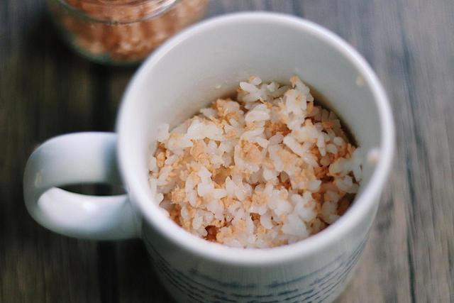 マグカップにあたたかいご飯と鮭フレーク、おろししょうがを入れて混ぜ合わせます。マグカップの大きさにもよりますが、カップいっぱいに入れてしまうと後から電子レンジで加熱する際に吹きこぼす可能性があるので、少なめに入れるのがポイントです。