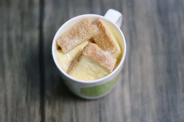 フレンチトーストを作ったことがある方はいつもと同じ要領でOK。まずは卵、牛乳、砂糖、バニラオイルを入れて混ぜ合わせます。そこに、食べやすい大きさに切った食パンを5分ほど浸し、500Wで3分ほど加熱します(様子を見ながら行ってください)。