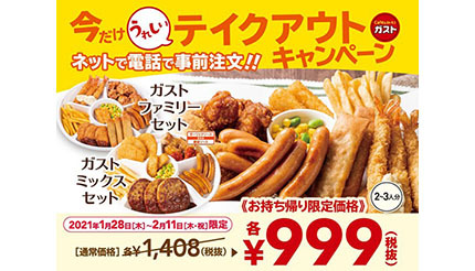 対象となるのは、ガストファミリーセットとガストミックスセットの2種類。通常価格で税別1408円が税別999円になる。注文は、ネットや電話で事前に行うことができる。