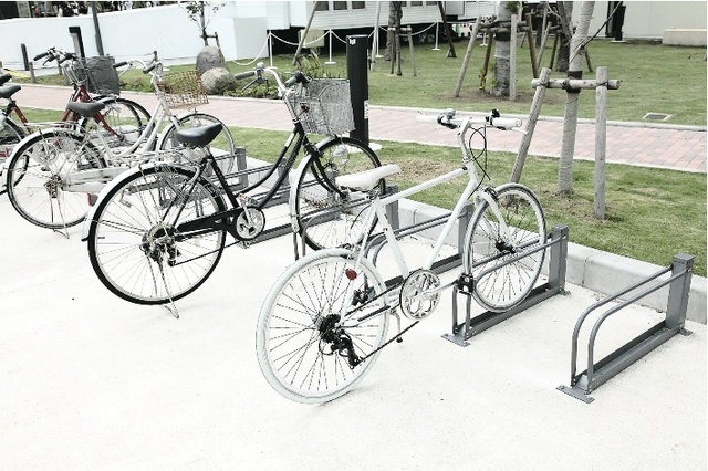 お台場の中には、約10台ずつ駐輪できる駐輪場(無料)があり、自分の鍵でロックする。
