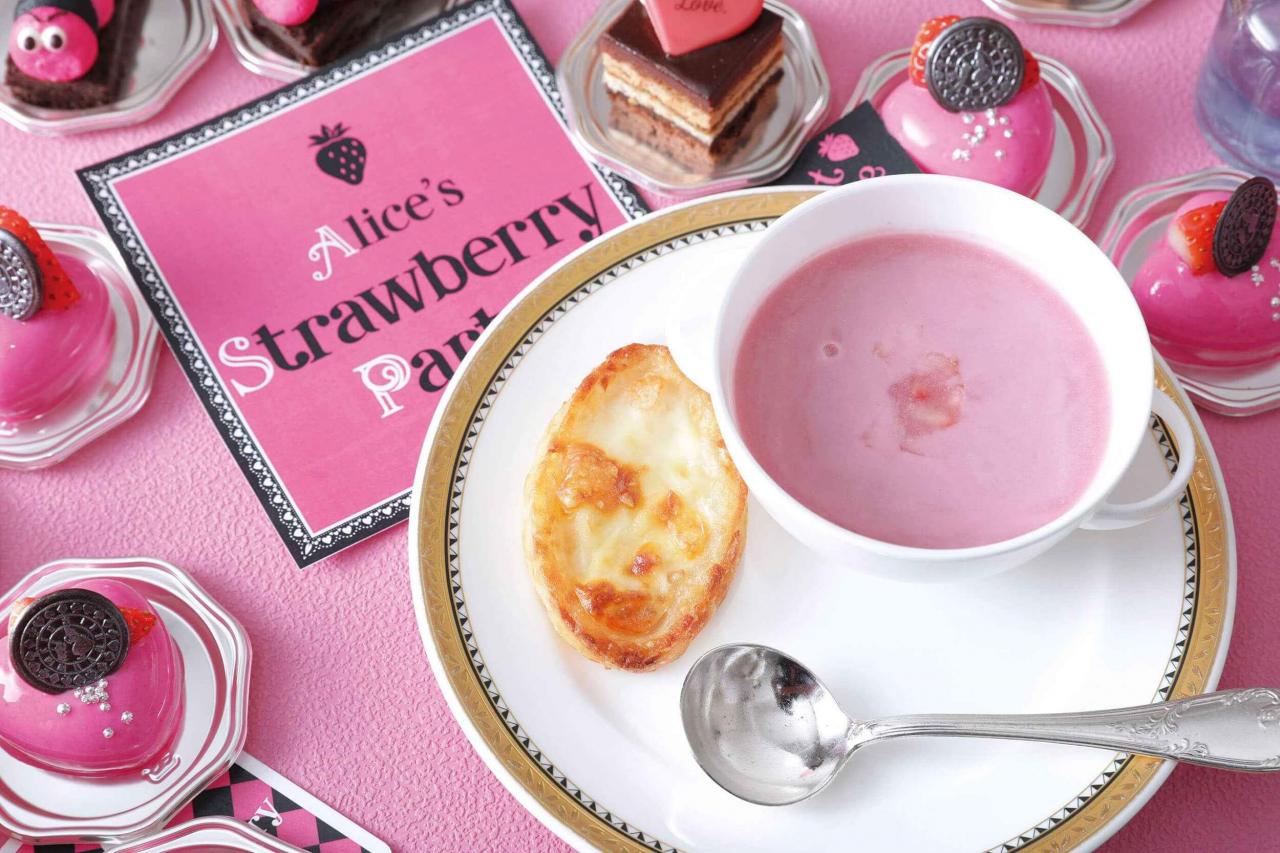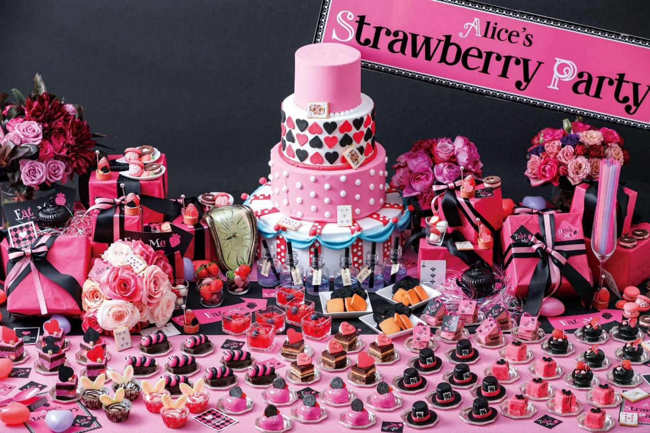 ハートの女王や白うさぎ、トランプ兵、チェシャ猫などの登場キャラクターを、旬のいちごを中心とした素材で表現。