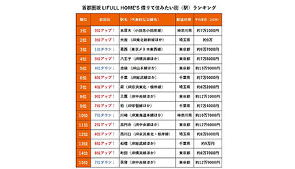 対照的に、前回まで4年連続1位の「池袋」が5位に後退したのを始めとして「川崎」(3位から10位)、「三軒茶屋」(6位から16位)、「吉祥寺」(9位から18位)など、都心周辺の人気エリアが軒並みランクダウンとなった。