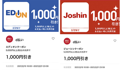 このキャンペーンと、2月1日から開始したd払いの週替わりクーポンは併用可能なため、2月21日まで配布中のエディオン、Joshin(ジョーシン)それぞれの1000円引きクーポンを適用して、税込み6000円以上の商品を1000円引きの価格で、dポイントカード提示後にd払いで支払うと、通常付与されるポイントとは別に、キャンペーン分として1000ポイント獲得できる。
