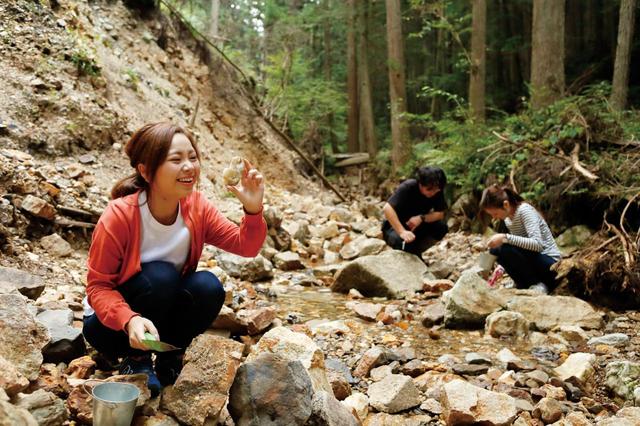 下呂市金山町にある笹洞鉱山の跡地で、パワーストーンとしても人気の蛍石のかけらを採集。子どもも宝探し気分で楽しめる。