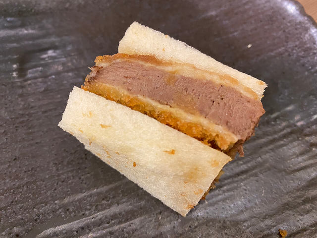 まずは定番「牛タンかつサンド」。犯罪レベルの美しい赤をで食欲をそそります。