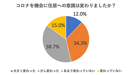 調査対象者に、新型コロナウイルス感染症の感染拡大を機会に、住居への意識が変わったかを尋ねたところ、「大きく変わった」が12.0%、「少し変わった」が34.3%で、約半数は意識が変化したものの、もう半数は変わっていないことが明らかになった。