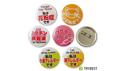 新製品は、ホログラムシートを使用し、きらきらと輝くデザイン。「私は花粉です」「ワクチン接種済み」「私は小麦アレルギーです」などと書かれており、6種類を用意している。