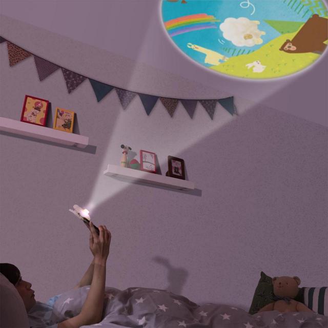 スマホのLEDライトと専用プロジェクターとおはなしディスクを使い、お部屋の天井に絵本を映し出します。無料でダウンロードできる専用のスマホアプリを操作しながら読み聞かせをします。
