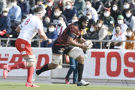 一方のクボタは開幕戦で宗像サニックスブルースを相手に快勝した。風下の前半からクボタペースで試合を進め17-7で折り返すと、後半早々3分にHOマルコム・マークスがトライ。さらに49分・52分と立て続けにトライを決めて勝負あり。43-17でボーナスポイントを手繰り寄せた。
