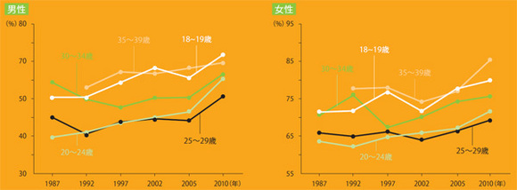 【パートナーをもたない未婚者の割合】 ⇒恋に消極的なのはプレッシャー世代だけじゃない? 全世代的にパートナーをもたない未婚者の割合は増加傾向にあり、プレッシャー世代特有の傾向とは言い難いことがわかる。/国立社会保険・人口問題研究所「出生動向基本調査」より
