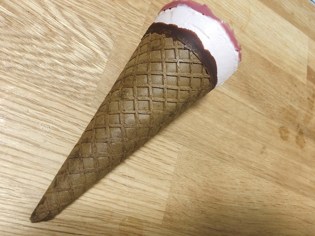 コーンアイスは上部にチョコやクッキーなどの材料が固まっていて、終盤はバニラとコーンのみで飽きてしまうことが多かったので、中盤にソースを入れるという工夫には驚きました。