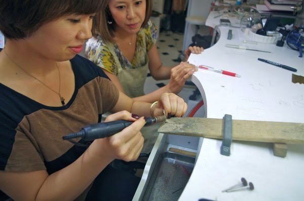次にコインの裏へ刻印棒でメッセージを打ち込みます。私は恋人のあだ名を入れてみました。このとき力加減を調整したり、刻印棒がズレないようにしっかり固定しておくことが重要だそう。このあたりから第2のメインイベントとなる、ガスバーナーの工程に入ります。パーツを接着する細かい作業です。