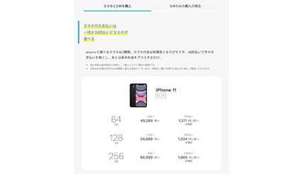 対応端末もあわせて公開。iPhone 6以降のiPhoneのほか、「HUAWEI P30 Pro HW-02L」「Galaxy Note10+ SC-01M」など、ドコモのAndroidスマートフォン72機種が対応する(一部機種は制限あり)。また、ahamo端末として、5G対応のドコモ スマートフォン「Galaxy S20 5G SC-51A」「Xperia 1 II SO-51A」と、「iPhone 11」(64/128/256GB)を取り扱う。