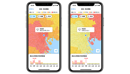 また、マップ上で任意の場所を指定することで、花粉がその場所で何時から、どの程度の量が飛散するのかを、市区町村別の色の塗り分けで表示する。自宅周辺や外出先の花粉量予報を、24時間先までひと目で確認できる。