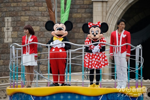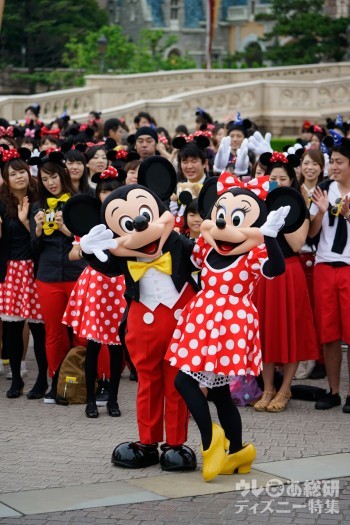ミッキーのサウンドセーショナル・パレード(ディズニーランド・リゾート)の音楽が流れる中、自分たちに仮装した500名のゲストを見て喜びます。
