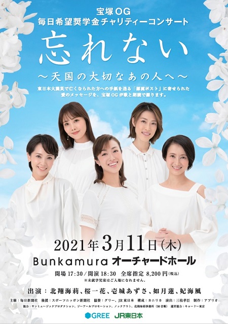 2021年3月11日、Bunkamuraオーチャードホールで宝塚OG 毎日希望奨学金チャリティーコンサート「忘れない~天国の大切なあの人へ~」を開催する。