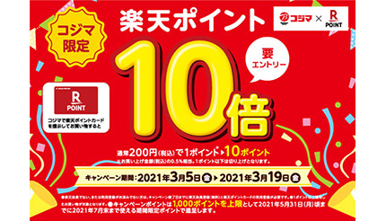 コジマは、3月5日に支払い時に楽天ポイントカードを提示するとポイントが通常の10倍になるキャンペーンを開始した。