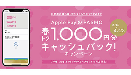 PASMO協議会とパスモは、iPhone 8以降で利用できる「Apple PayのPASMO」限定の「春トク!1000円分キャッシュバック」キャンペーンを3月15日から4月23日まで実施する。